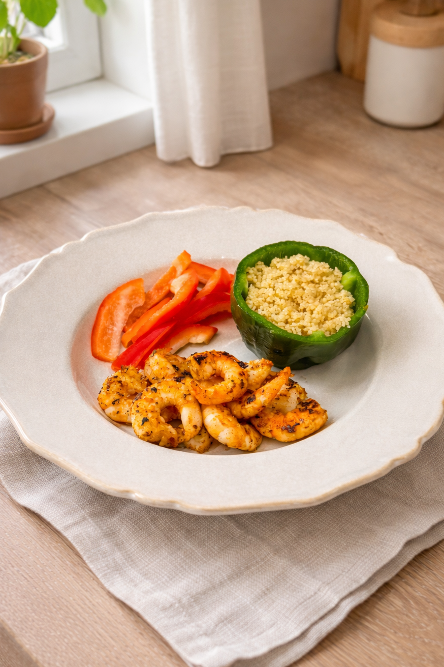 A quick, flavorful couscous dish with spiced shrimp and bell peppers—light, high in protein, and easy to make.